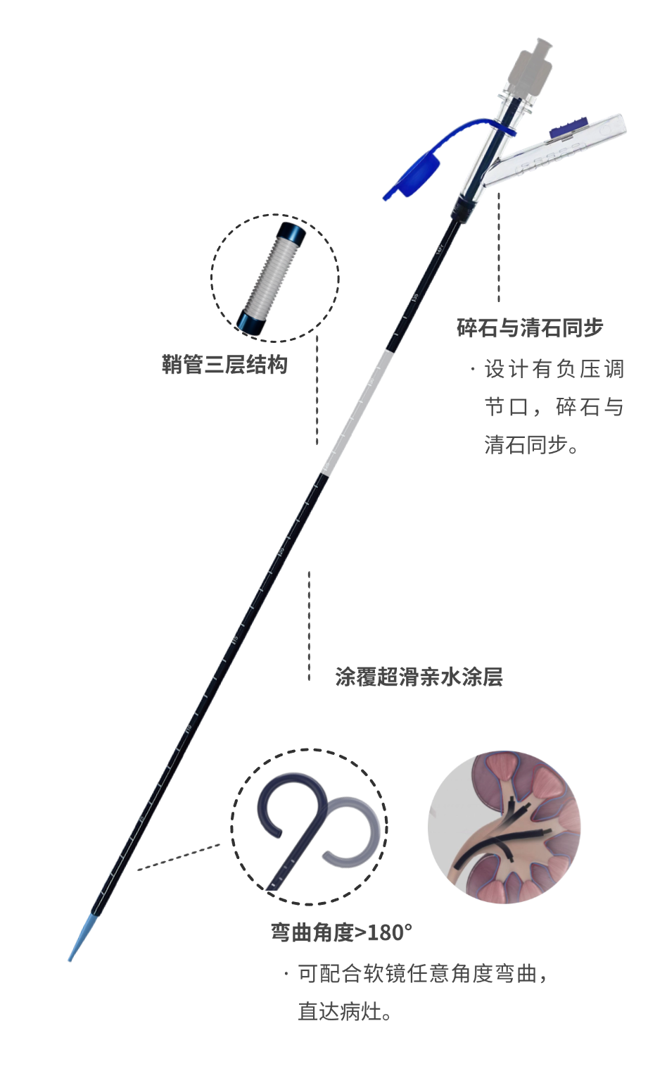 可配合软镜任意角度弯曲,直达病灶,提高结石清除率;