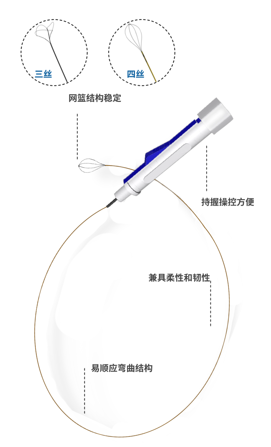 超高的柔性及韧性,操作灵活,有利捕获结石,不会对泌尿系统造成过多刺激。
