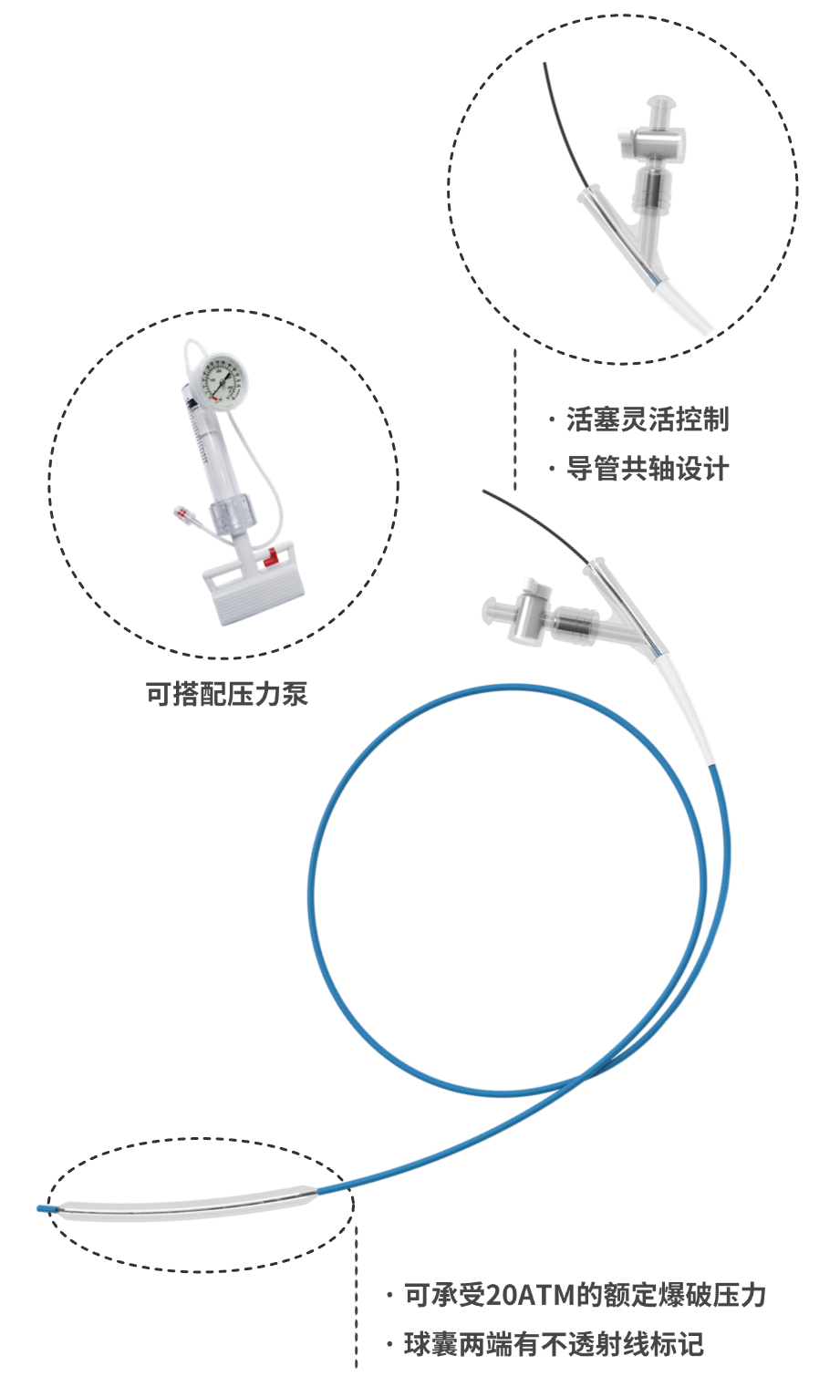 导管共轴设计,增加推动力传达,使球囊导管在弯曲而狭窄的病变腔道内推进畅通无阻;